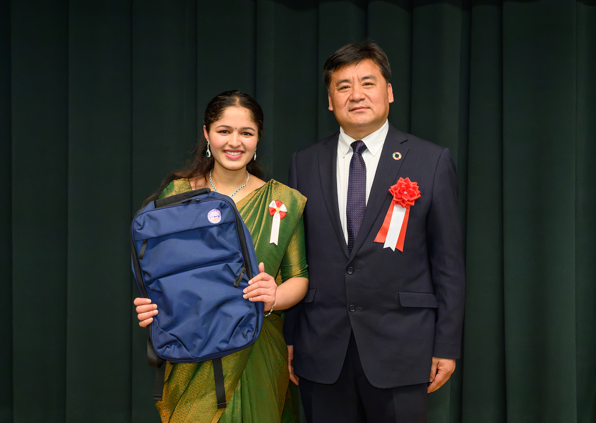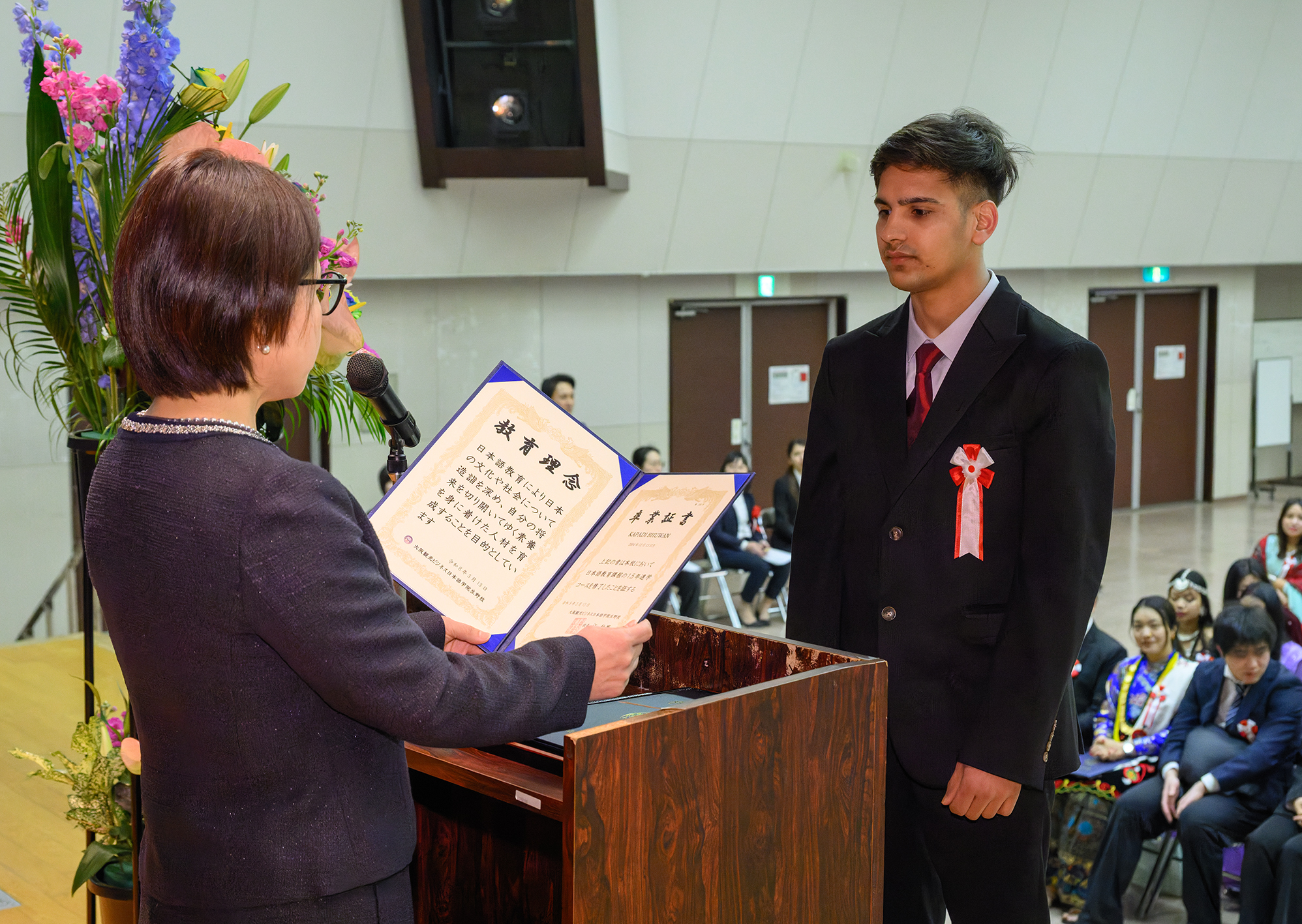 式は、卒業生への卒業証書授与から始まりました。名前が呼ばれると、学生たちは少し緊張した表情で壇上へ上がり、誇らしそうに証書を受け取っていました。その姿からは、日本での学習や生活の中で積み重ねてきた努力と成長が感じられ、会場からは大きな拍手が送られました。