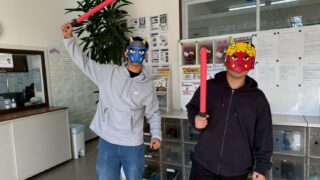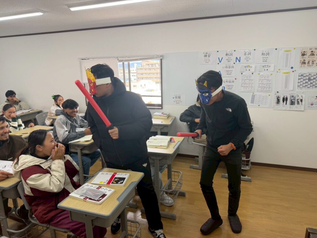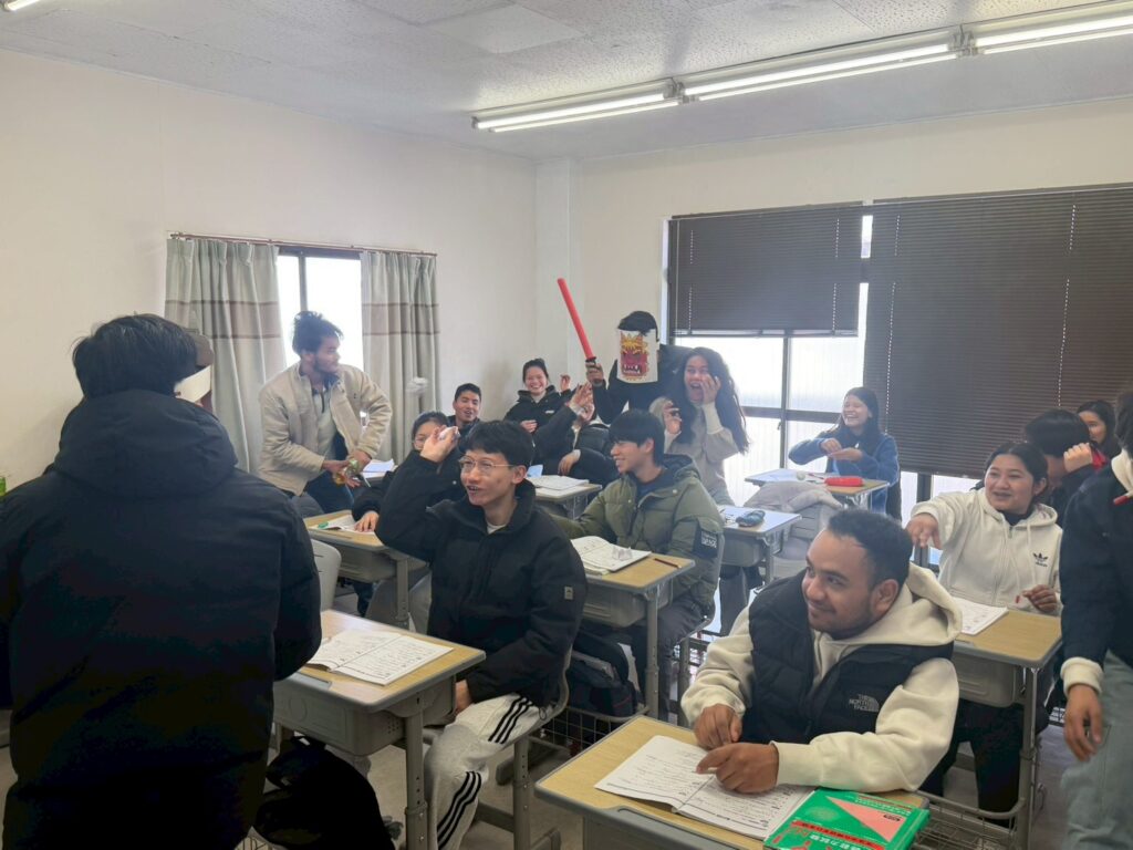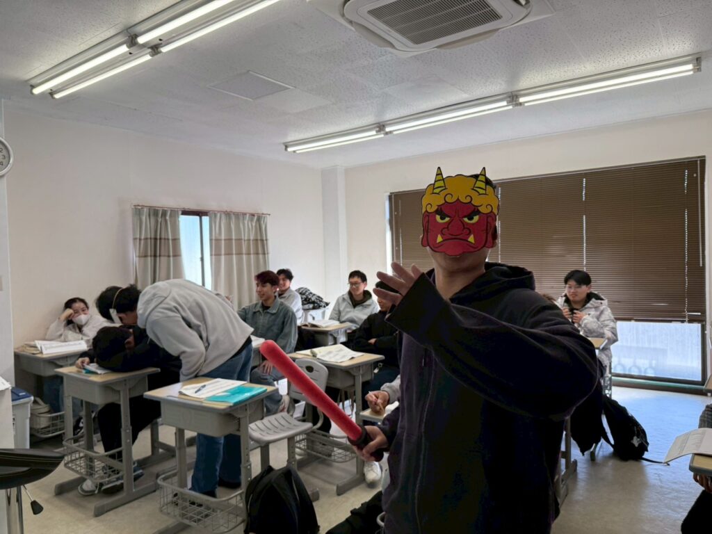 鬼のお面をつけた先生が教室に入ると、学生たちは驚きながらも楽しそうに豆まきを行いました。