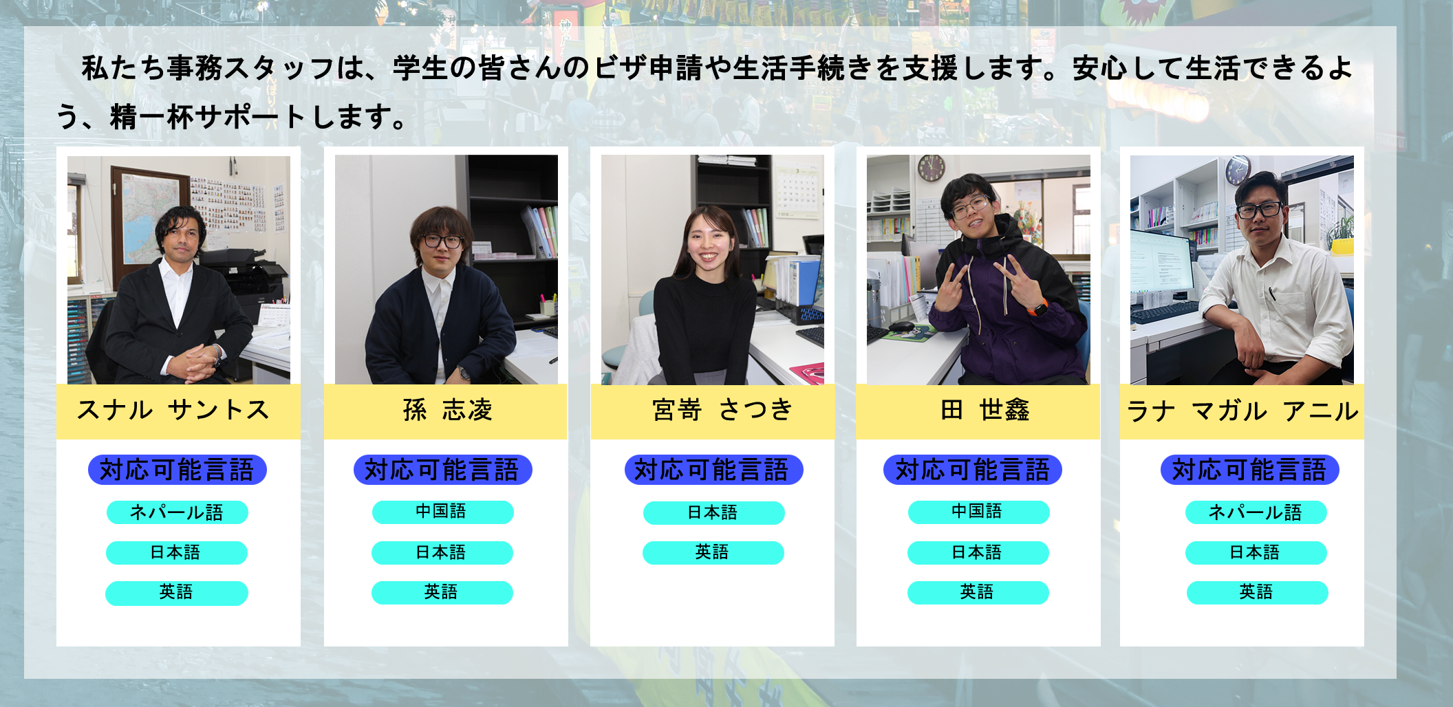 皆さんは初めてお父さん、お母さん、兄弟と離れて海外で勉強や生活をすると思います。最初の頃「一人暮らしは寂しい、日本の生活に慣れない、家族に会いたい」色々な不安があるでしょう。しかし、あなたは一人ではありません、あなたのそばに先生たち、お友達がたくさんいます。困ったことがあった時、相談したいことがある時にぜひ私と相談してください。いつでもサポートをしますので一緒に乗り越えましょう。皆さんの成長をご家族に見せてください。